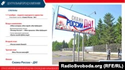 У «Стратегії» розписані декілька етапів так званої піар-кампанії. Головні слогани ‒ «Скажи Росії так» і «Росія тут назавжди».