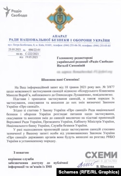 Рада нацбезпеки і оборони України не розглядала можливість застосування санкцій щодо білоруського олігарха Миколи Вороб’я – друга і бізнес-партнера Віктора Медведчука, наближеного до Олександра Лукашенка, бо не отримувала таких пропозицій від суб’єктів, які на це уповноважені. Зокрема, Верховної Ради, Президента, Кабміну, Нацбанку і СБУ. Про це йдеться у відповіді РНБО на інформаційний запит журналістів програми «Схеми» (проєкт Радіо Свобода та UA:Перший).
