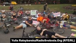 Потім, за командою організаторів, учасники акції лягли на асфальт біля своїх велосипедів, символічно зображуючи тіла збитих на дорозі велосипедистів. Один із організаторів – накрився плівкою.