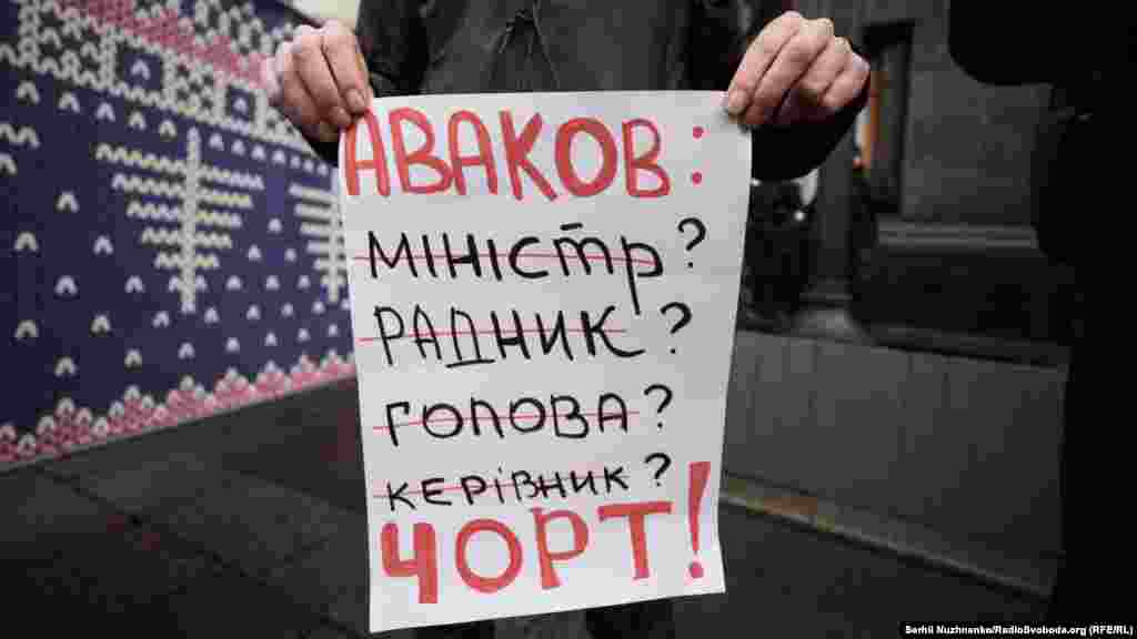 Декілька десятків активістів зібралися під Офісом президента з плакатами «Аваков чорт», «Тимчасовий міністр – час вийшов», «Авакова у відставку».
