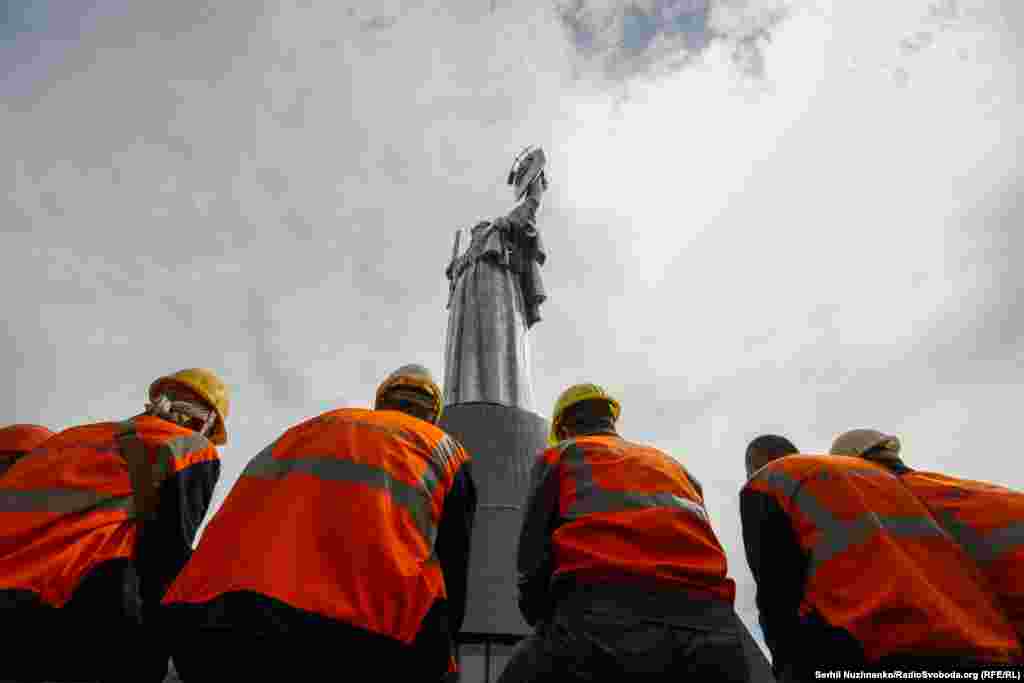 Монумент «Батьківщина-мати» розташований на території Національного музею історії України у Другій світовій війні. Він був споруджений у 1981 році і вважається найвищою скульптурою у Європі. Вага елементу герба, який демонтували в перший день – 120 кілограмів. Як розпочався демонтаж емблеми – дивіться у репортажі.