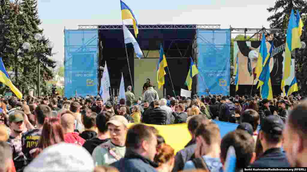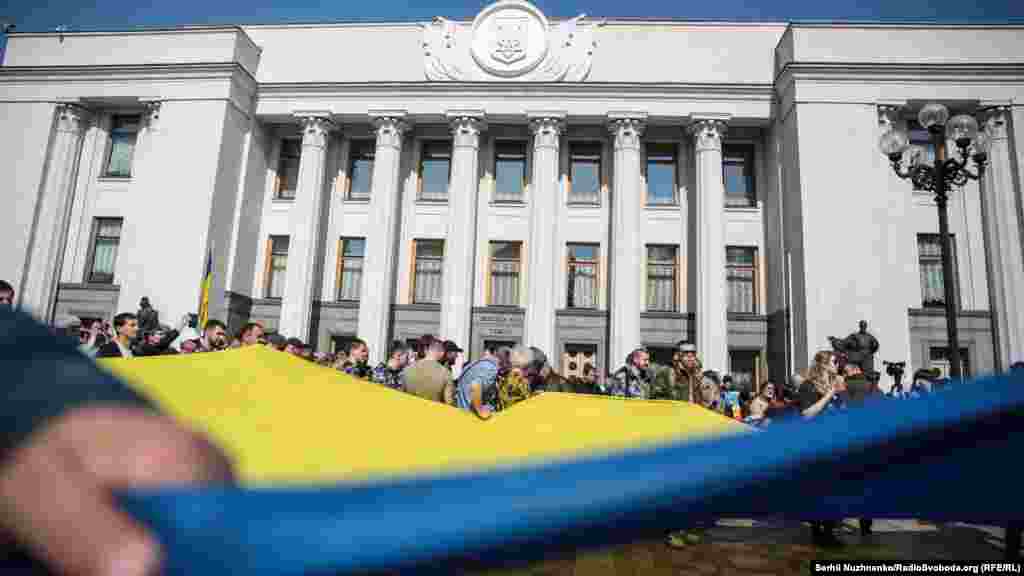 Близько тисячі людей зібралося під стінами українського парламенту, де проходила акція на підтримку закону про державну мову. Учасники тримали в руках плакати із закликами говорити українською і підтримати мовний закон.