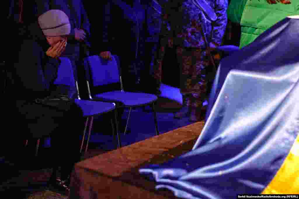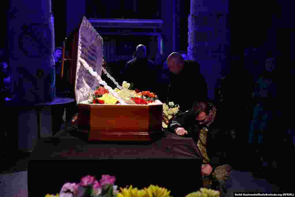 Близькі Василя Кухарського біля його домовини під час прощання в Театрі на Подолі