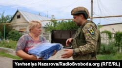 Моя співрозмовниця одна з 49 людей, що лишилися на три навколишні вулиці. Раніше тут мешкало понад 90 людей. Завітали капелани до пари, щоб передати для них і сусідів спеціальну плівку. Нею можна накрити ушкоджені російськими обстрілами будинки і хоч трохи вберегти їх від руйнування негодою.