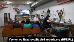 Заходимо в найбільше приміщення пункту – посередині крісла. В них з десяток людей – дивляться телевізор. На екрані – випуск новин «Телемарафону». Ще пару людей вмостилися біля стіни з ноутбуками. В кінці зали – буфет.