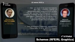 «Вже всіх там на вуха поставила. Ось товариш, зараз він – заступник начальника Генерального штабу, а він був на нараді, і я йому сказала: «Тепер м’яч на твоєму боці вже давно. Давайте хід цьому всьому». І він вже дав доручення, і ці всі документи пішли в роботу. Вже доповіли головнокомандувачу, начальнику Генштабу, тобто все це пішло, В’ячеславе Саничу», – казала в телефонній розмові Ульяненко Богуслаєву 22 липня 2022 року.