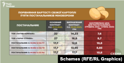 Аналіз «Схем» виявив наступне. У засекречені грудневі контракти з МО постачальники заклали таку ціну на картоплю: від 17,7 гривень і аж до 27 гривень за кілограм. Після скандалу деякі фірми знизили ціну до 12,6 грн/кг, а деякі – так і залишили 17,7 грн/кг.