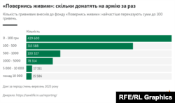 Це єдина волонтерська організація, з показників якої вдалося визначити, скільки українці зазвичай жертвують на армію за раз: до 100 гривень включно.