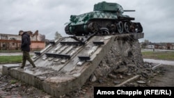 ТРОСТЯНЕЦЬ – Фотографії з міста Тростянець Сумської області у березні 2022 року – мабуть, найбільш вражаюче іронічне зображення повномасштабного російського вторгнення в Україну. Радянський танк Т-34 [на фото] входив до складу батальйону, який звільняв Тростянець з-під контролю нацистів у 1943 році. Тоді у роки Другої світової війни танк залишився неушкодженим. Зараз його ледь не зруйнували російські війська. На фото пошкоджений танк стоїть на постаменті посеред знищеної ЗСУ сучасної російської військової техніки.