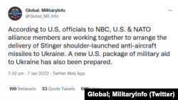 Переклад твіту: Згідно з американськими посадовцями, з якими розмовляло NBC, США та члени союзу НАТО працюють разом задля налагодження постачання переносних протиповітряних ракетних комплексів «Стінгер» Україні. Новий пакет американської військової допомоги Україні також готується: