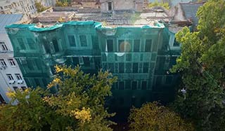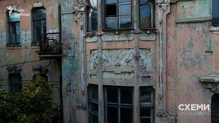 Але наразі будинок стоїть невідреставрований, фасад завішено банером, який на початку вересня замінили на свіжий.
