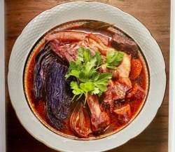 - Усе це заливається пів літрою червоного вина і пів літрою води, варити 40 хв. Накраяти туди все, що вам тільки захочеться – це має бути брутально і анахронічно».