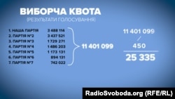 - Щоб зрозуміти, хто проходить у Раду, спочатку треба визначити виборчу квоту. Тобто, скільки голосів виборців, так би мовити, «коштуватиме» одне депутатське крісло у Раді. Для цього додаємо голоси за всі партії, які подолали 4-відсотковий бар’єр і ділимо на 450 ‒ кількість місць у Раді. Ось стільки голосів і «коштуватиме» один депутатський мандат.