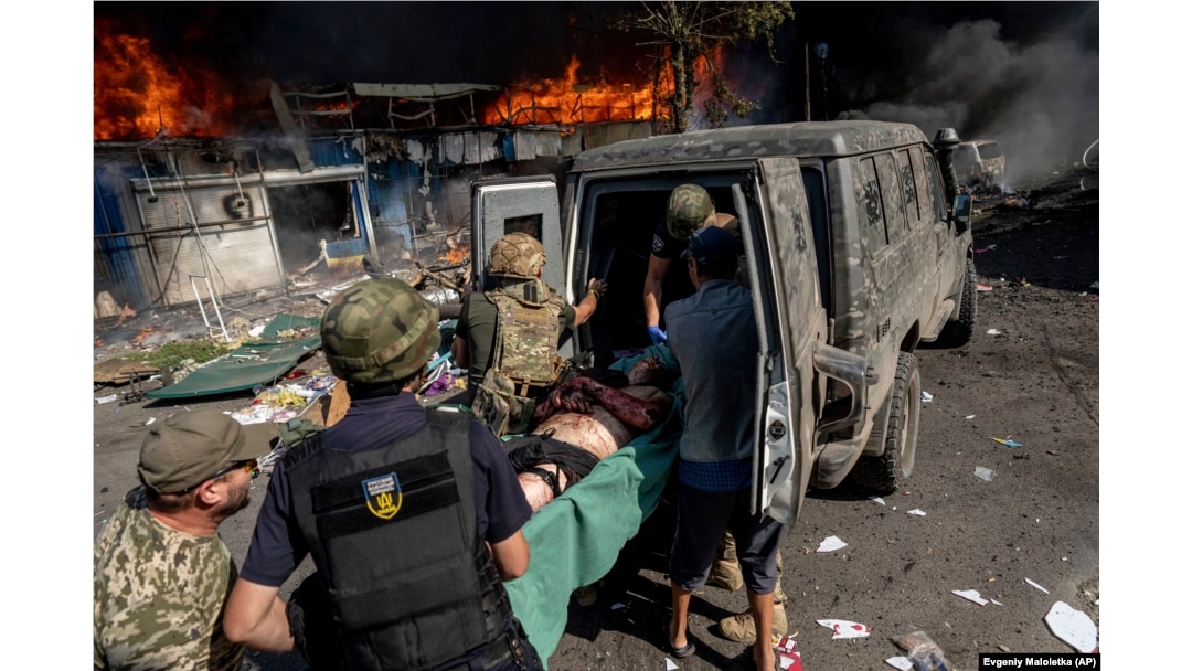 Розкидані тут і там гроші, різний крам, кавуни, овочі, документи, копчені курки і – кров, багато калюж крові поруч із тими, що утворилися від роботи пожежних. 16 загиблих і 33 поранених – такі наслідки обстрілу Росією ринку у Костянтинівці станом на ранок 7 вересня.